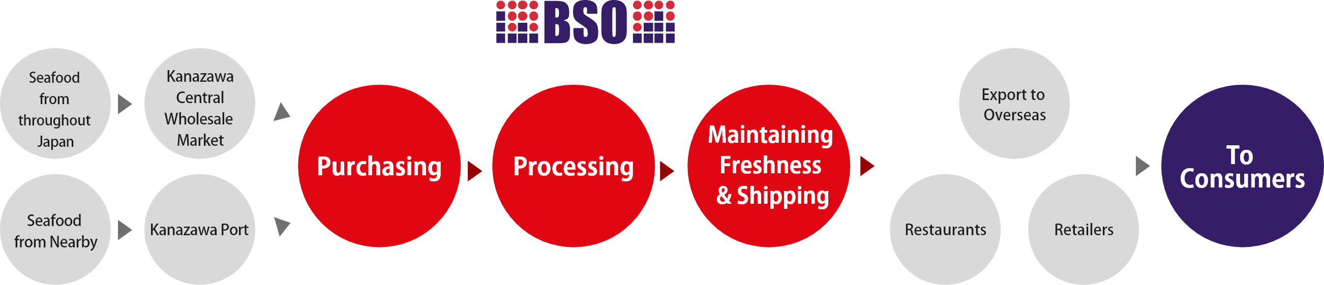 BSO is located in Ishikawa Prefecture, in the center of Japan, and we have built a nationwide network that provides us with ready access to a broad variety of fresh seafood from around the country. We make the most of our location, purchasing seafood from throughout Japan based on customer requests, then selling it wholesale. Our processing plant is just a stone’s throw away from the Kanazawa Central Wholesale Market, too: this means that we can begin processing fresh seafood almost immediately after the morning auctions.